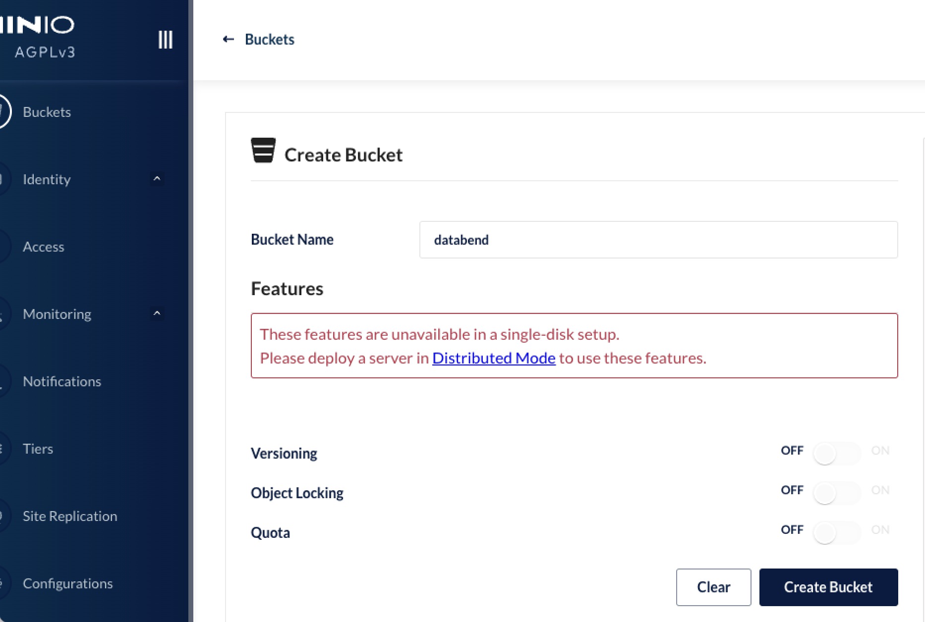 Use the MinIO Admin web interface to create a bucket named as "databend":