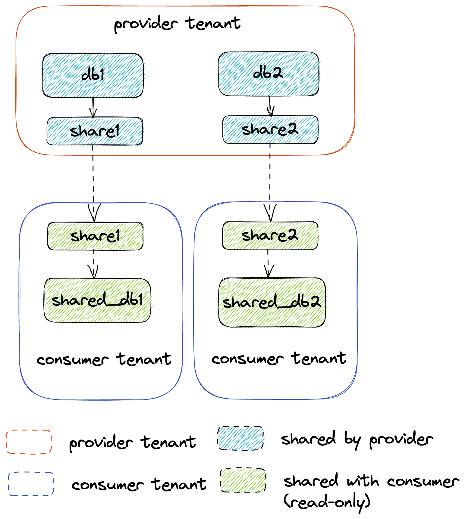 • The provider creates a share of a database in their account and grants access to specific objects in the database. One or more tenants(aka consumers) are then added to the share, which can access the shared database and other shared objects.